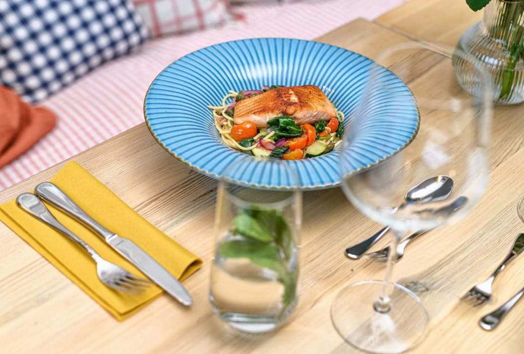 Duża średnica 300 mm oraz szerokie, lekko uniesione ranty sprawiają, że talerz idealnie sprawdza się do podawania makaronów, past, risotto, sałatek, dań jednogarnkowych oraz efektownych kompozycji obiadowych. Głęboka część centralna umożliwia estetyczne serwowanie sosów i dań o płynnej konsystencji, zachowując elegancką prezentację.