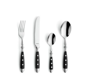 Sztućce Amefa Country wyróżniają się unikalnym designem inspirowanym stylem retro. Połączenie stali nierdzewnej z czarnymi, nitowanymi rękojeściami tworzy efektowny kontrast i nadaje zestawowi charakteru.