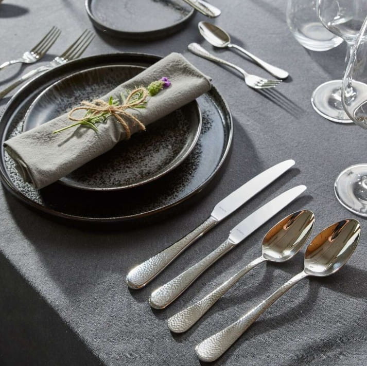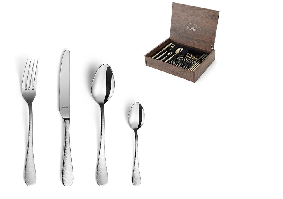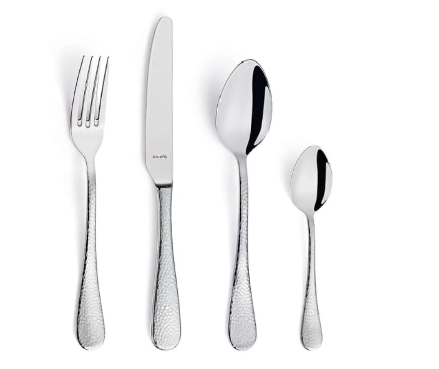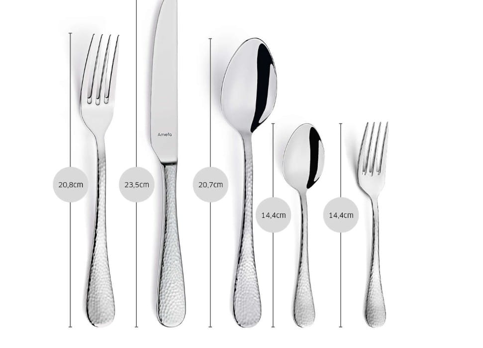 Młotkowane sztućce wykonane z hartowanej stali. Model z zaokrąglonymi końcami rękojeści. Idealny do użytku profesjonalnego. Cały nóż ma długość 23,5 cm, ostrze 11,2 cm. Sztućce polerowane. Materiał: stal 18/10 Zestaw zawiera: 6x nóż stołowy 6x widelec stołowy 6x łyżka stołowa 6x łyżeczka do herbaty