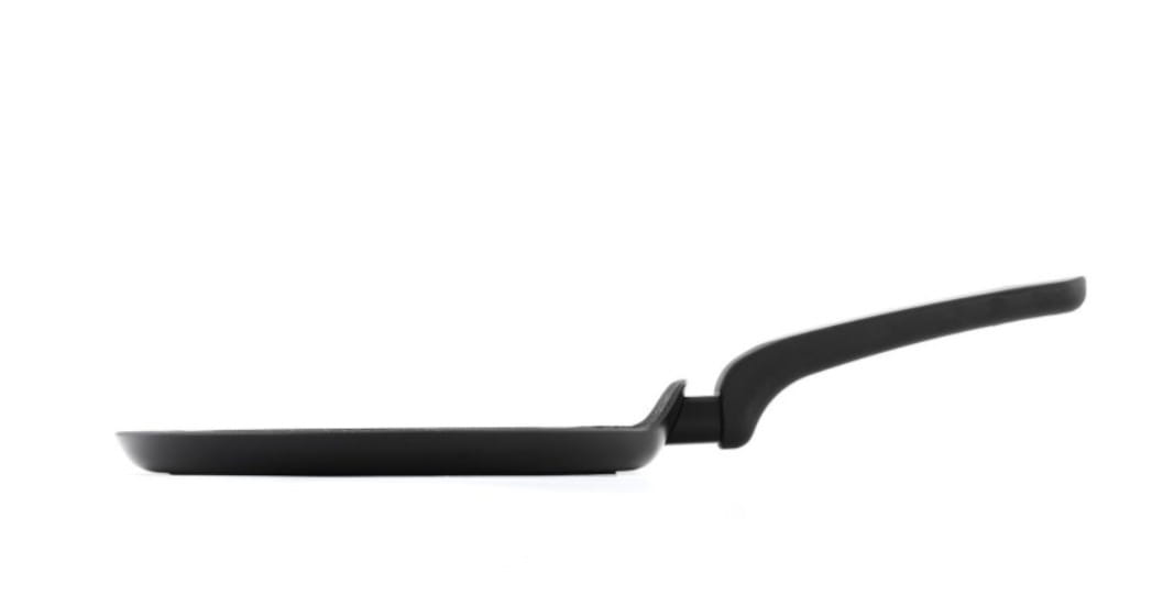 Niska krawędź patelni ułatwia wygodne obracanie naleśników i zdejmowanie ich z powierzchni smażenia. Ergonomiczny bakelitowy uchwyt z powłoką Soft Touch oraz podparciem dla kciuka zapewnia stabilny i bezpieczny chwyt. Uchwyt nie nagrzewa się podczas gotowania, co zwiększa komfort użytkowania. Patelnia nie jest przeznaczona do używania w piekarniku.
