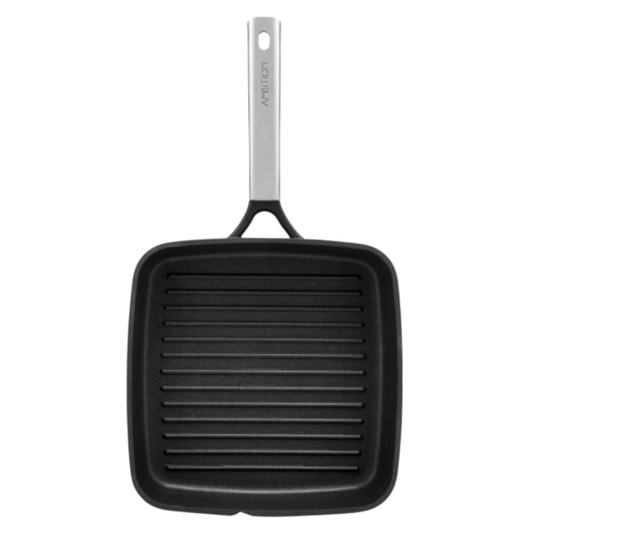 Patelnia grillowa Taurus 26 × 26 cm marki Ambition to wysokiej jakości naczynie kuchenne stworzone z myślą o osobach, które cenią wygodę gotowania, trwałość i nowoczesne rozwiązania w kuchni. Wykonana z solidnego odlewanego aluminium, patelnia doskonale przewodzi i równomiernie rozprowadza ciepło, dzięki czemu przygotowywanie potraw jest szybsze, bardziej energooszczędne i pozwala uzyskać idealne rezultaty smażenia oraz grillowania.